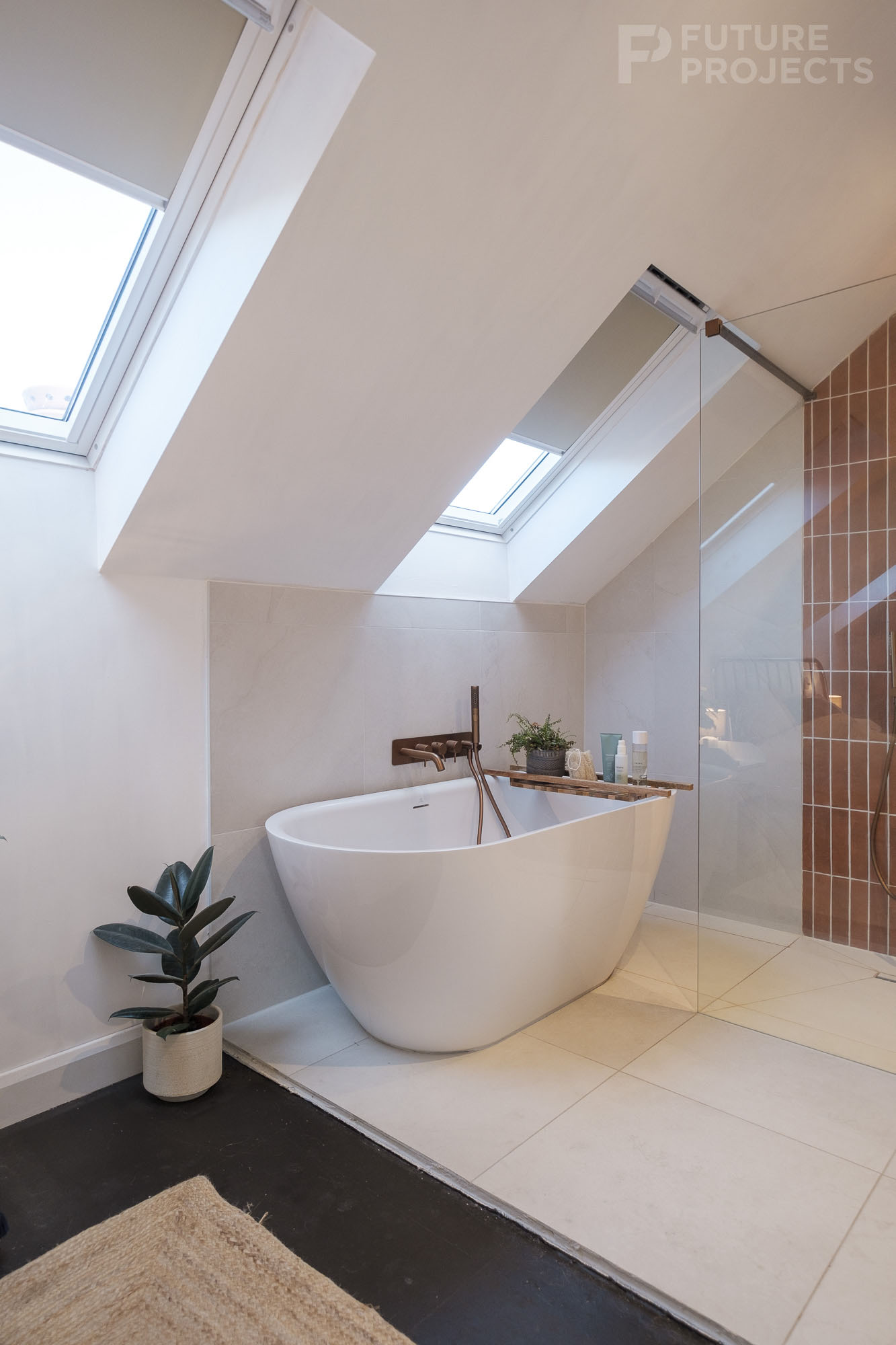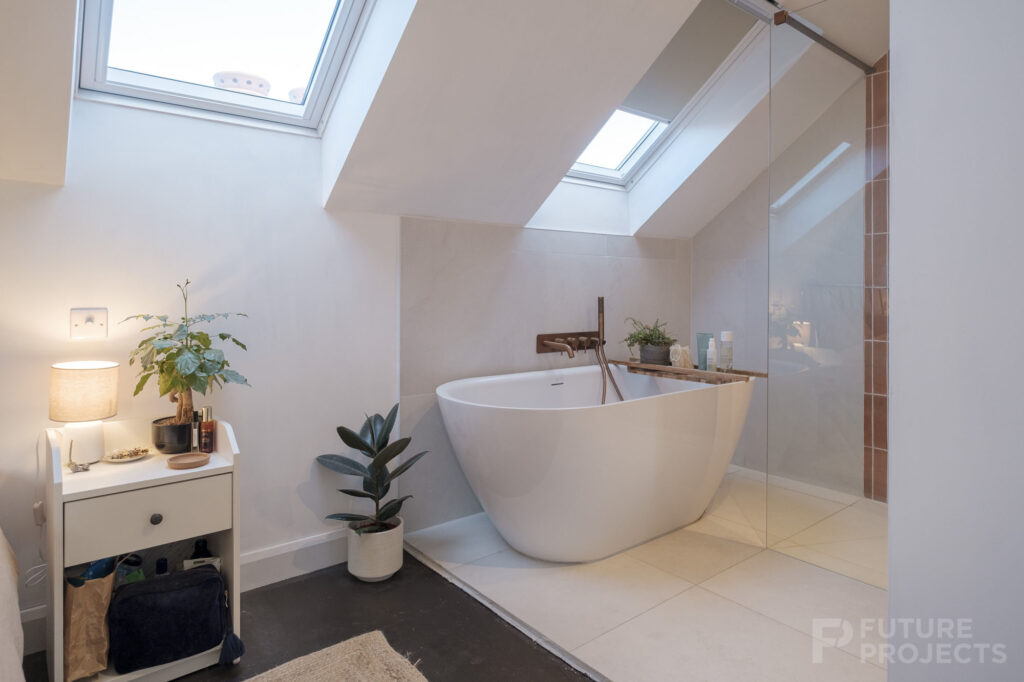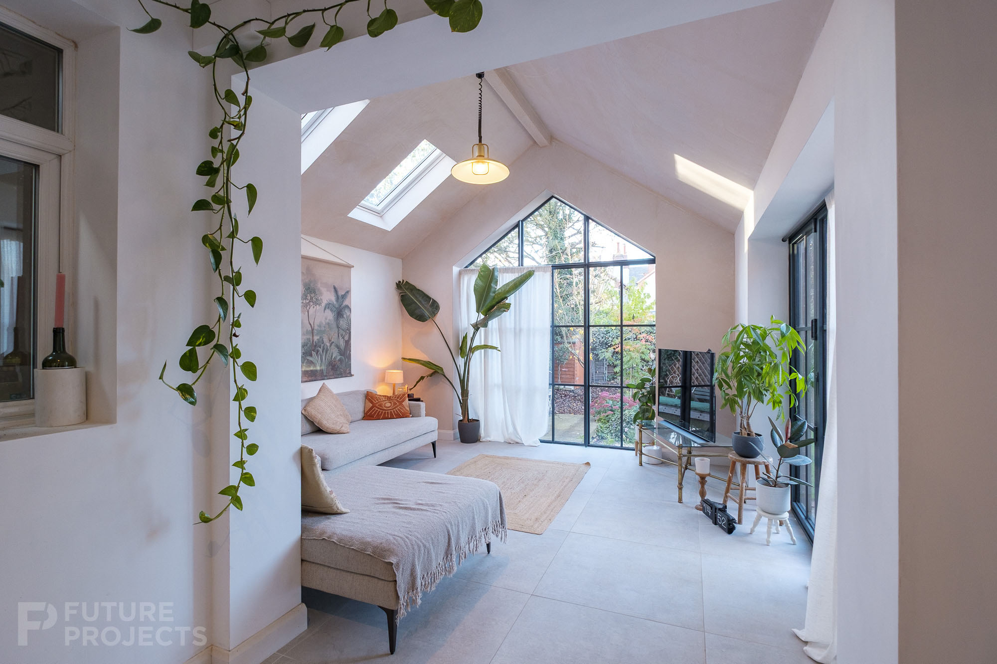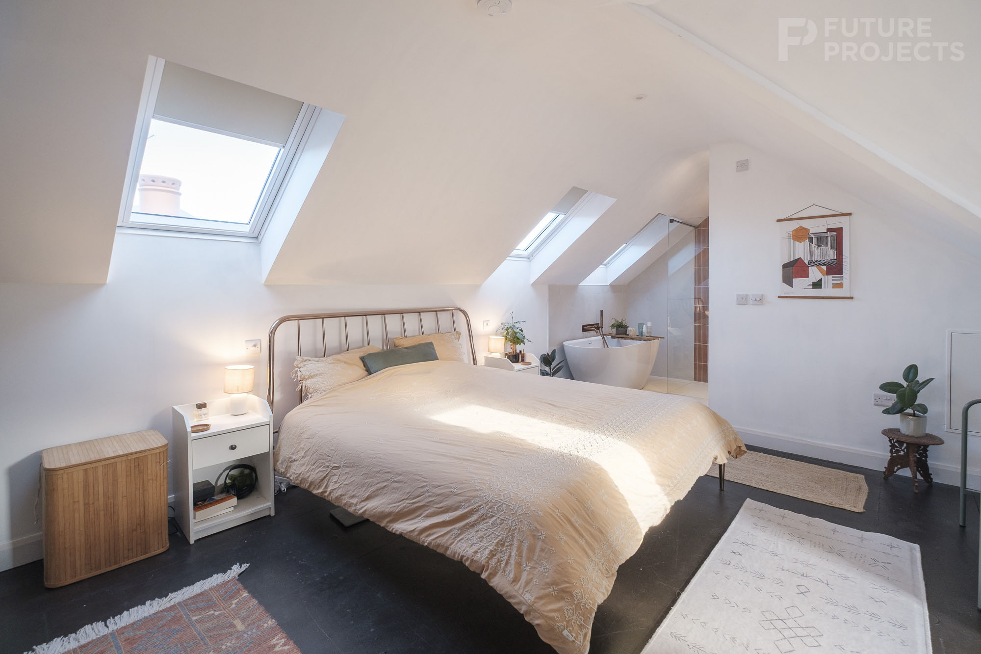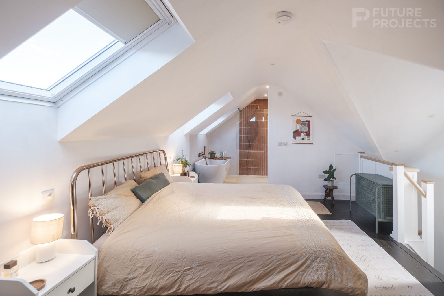 For this stunning home renovation in Clifton, York, Future Projects completely transformed the property inside and out. We raised the existing roof by several feet to create a spacious master suite featuring a high, vaulted ceiling with roof lights and Velux windows, giving the room a bright and airy feel.