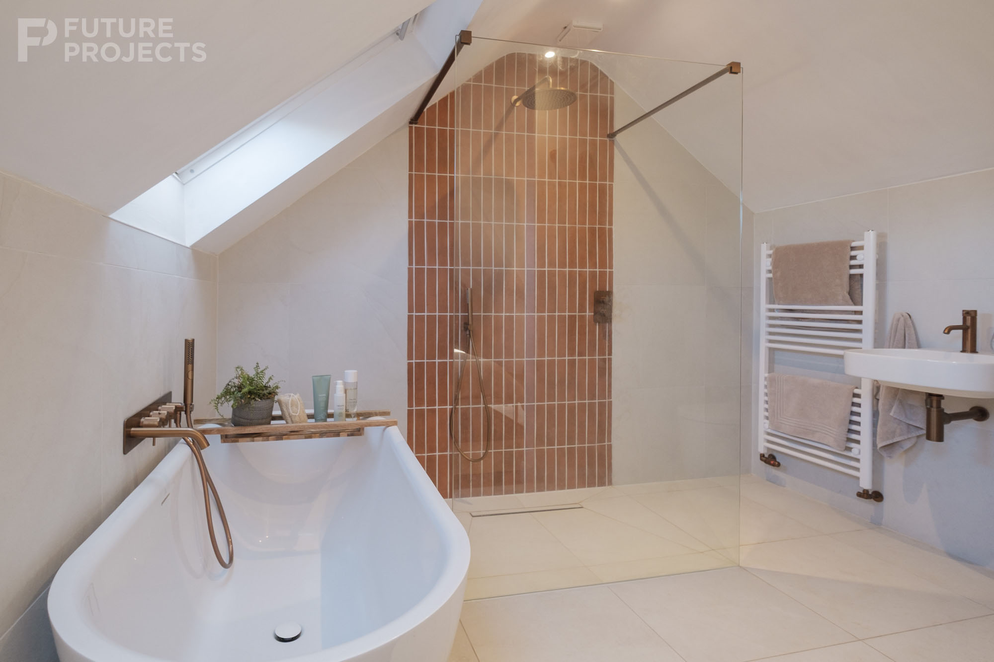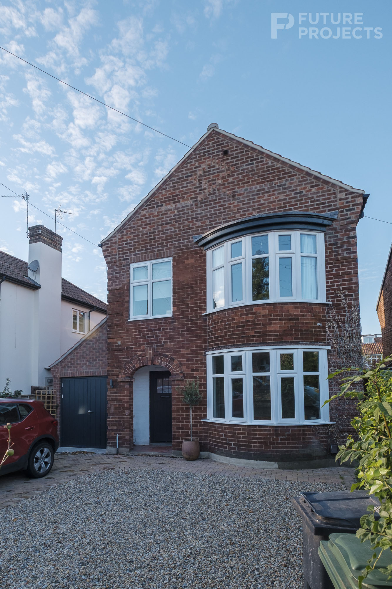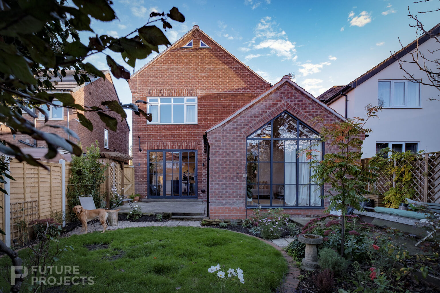 The ground floor extension features elegant crittall-style doors by Lowther Aluminium, and the new roofs were expertly installed by our sister company, Future Roof. Upstairs, we re-planned the layout to introduce a stylish new house bathroom, supplied and fitted by York Bathrooms.All building works were carried out by our talented in-house team at Future Projects.